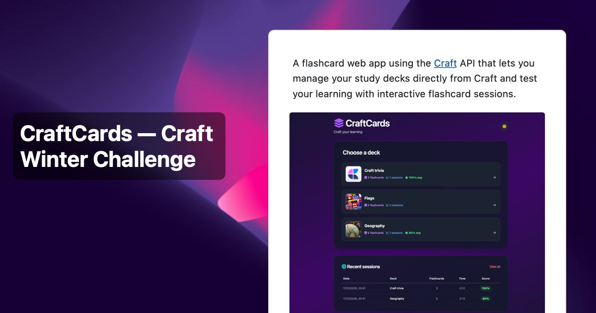Flashcard web app using Craft API. Manage study decks in Craft, test your learning interactively.