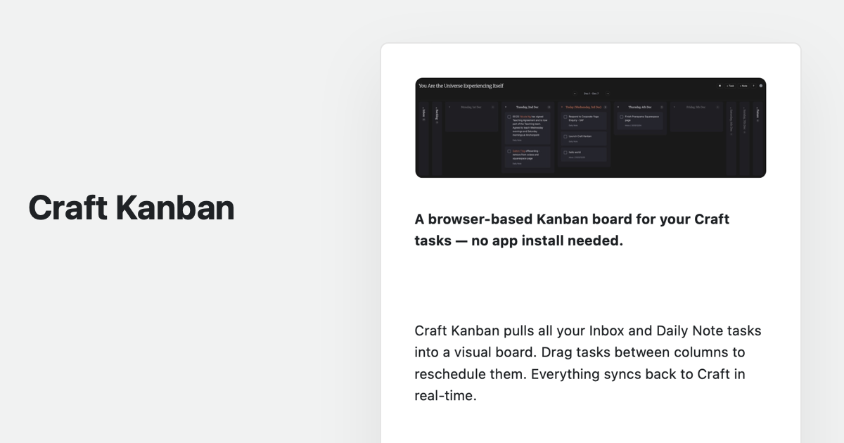Personal Kanban connected to Craft. Turn notes into visual cards and execute from a clean board.