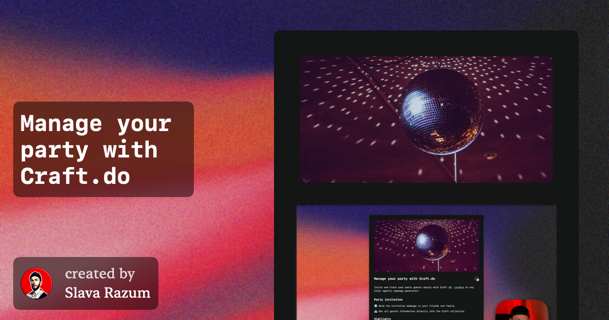 Party invitation manager. Guests RSVP via web, data flows into your Craft collection.