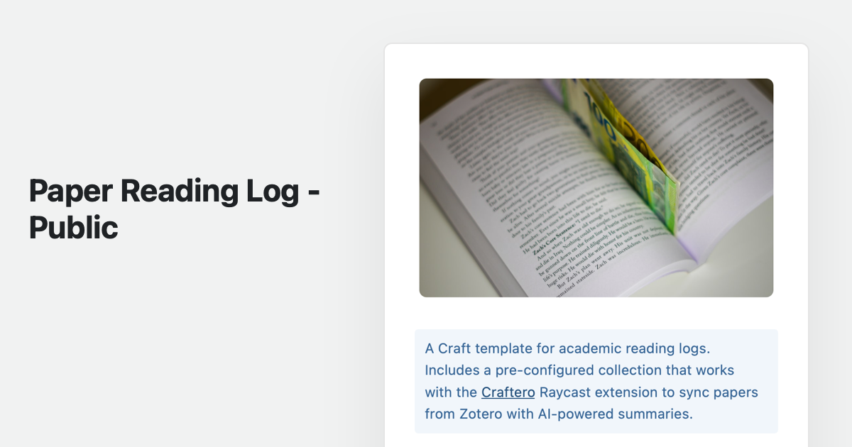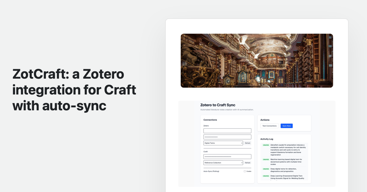 Zotero to Craft sync with auto-deduplication. Fetch references into collections with premade templates.