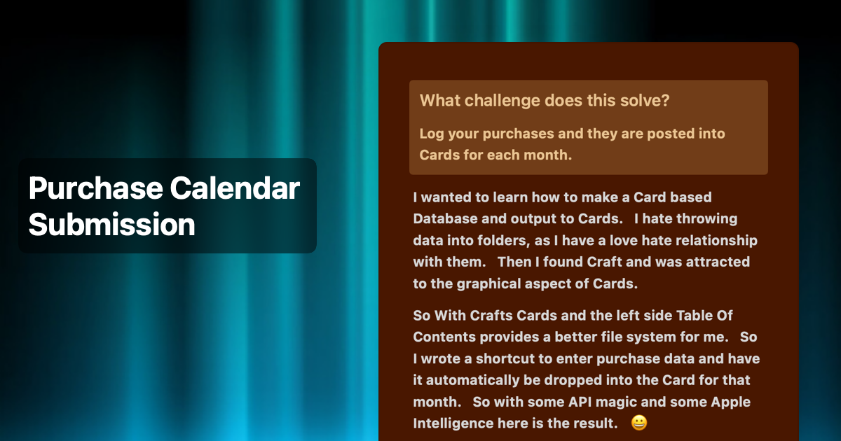 Log purchases via Shortcut directly into monthly Card-based databases in Craft.