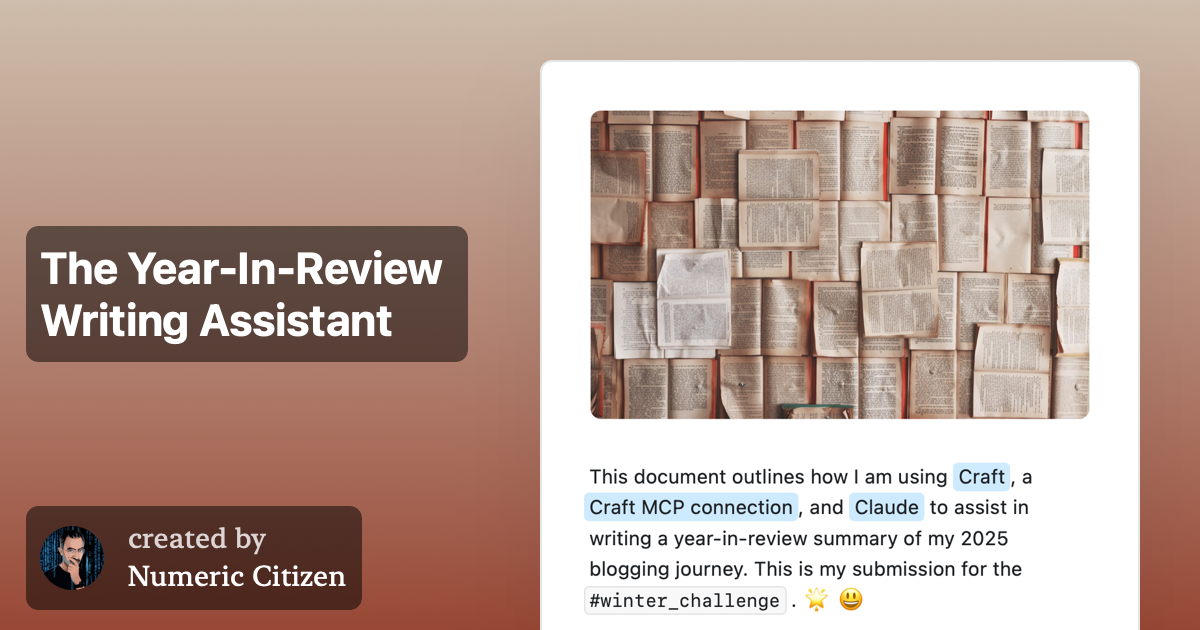 Year-in-review writing assistant. Use Craft MCP and Claude to summarize your blogging journey.