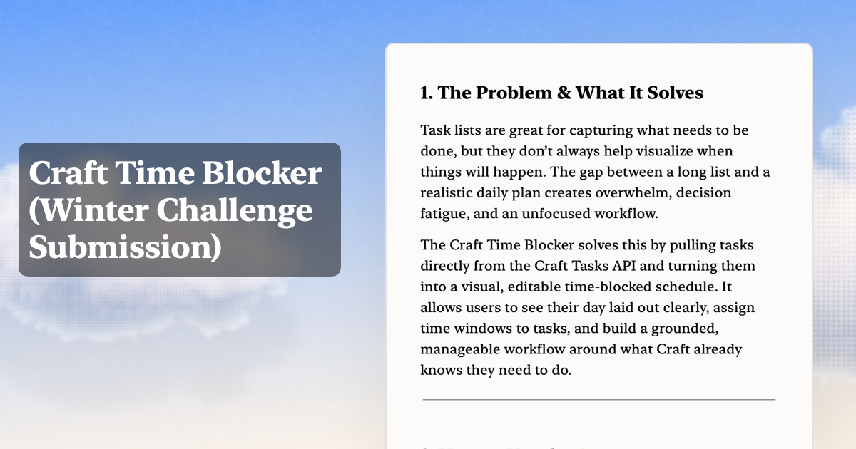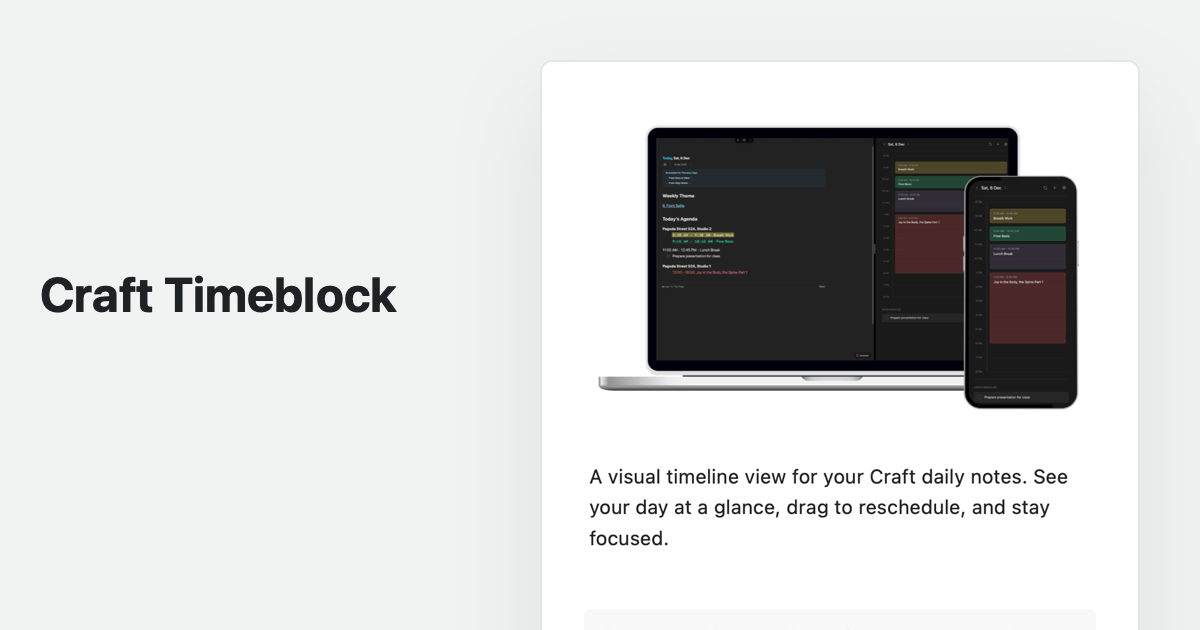 Visual time-blocked schedule from Craft Tasks API. Assign time windows and build realistic plans.