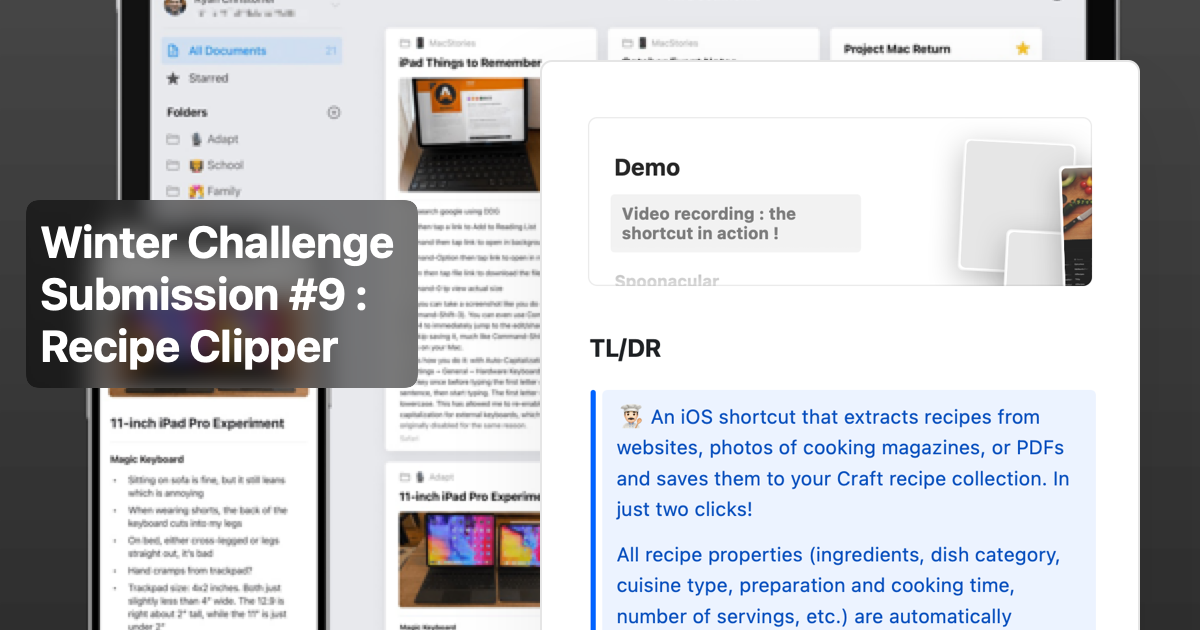 iOS shortcut that extracts recipes from websites, photos, or PDFs into your Craft recipe collection.