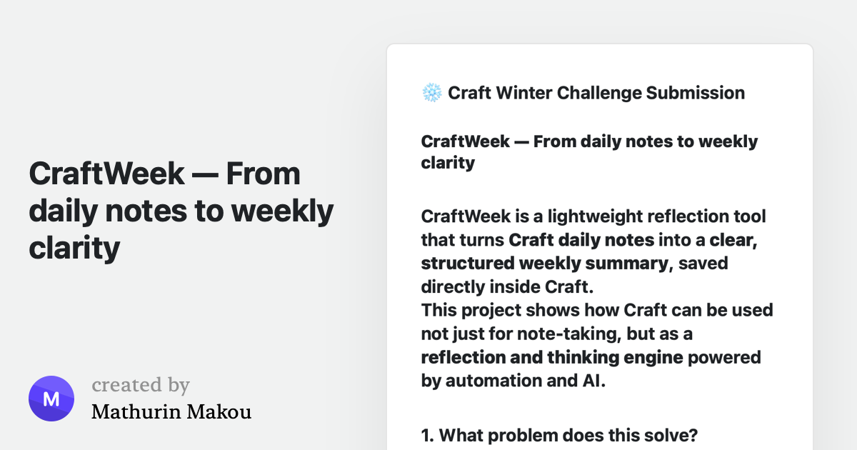Turn daily notes into weekly clarity. Auto-generate themes, decisions, open loops, and insights.