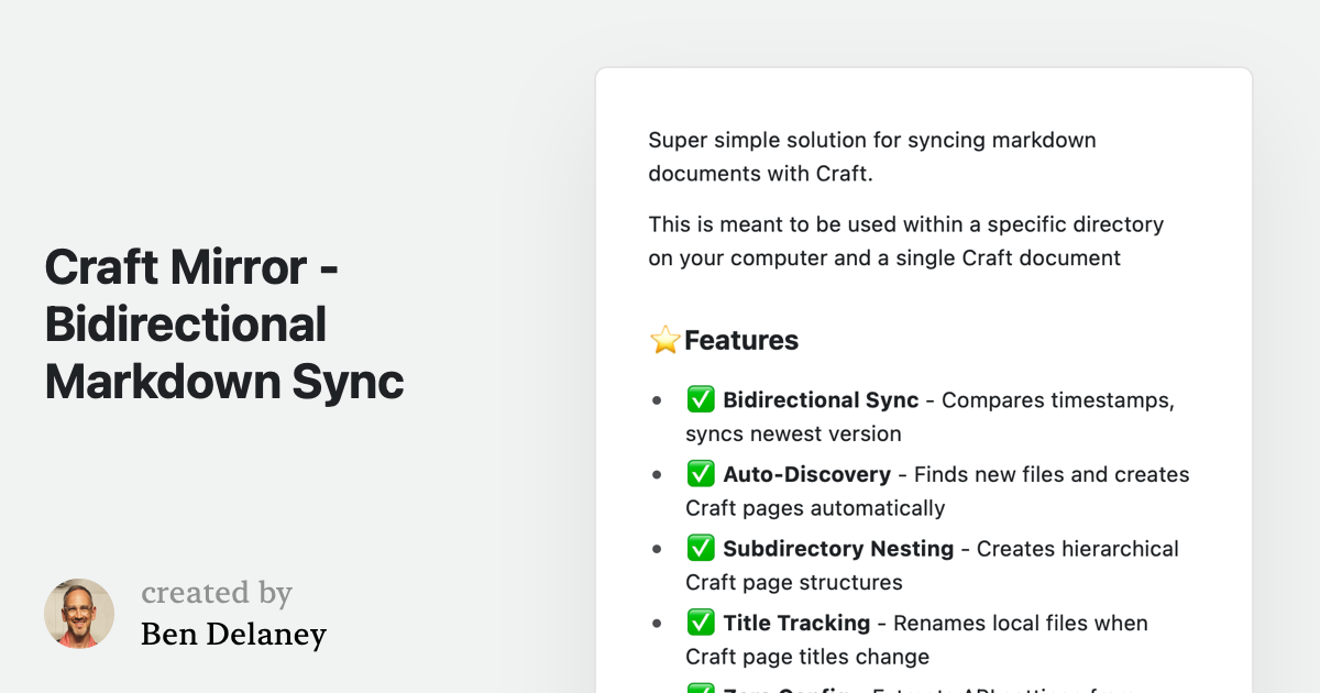 Bidirectional markdown sync. Local files and Craft pages stay in sync with auto-discovery.