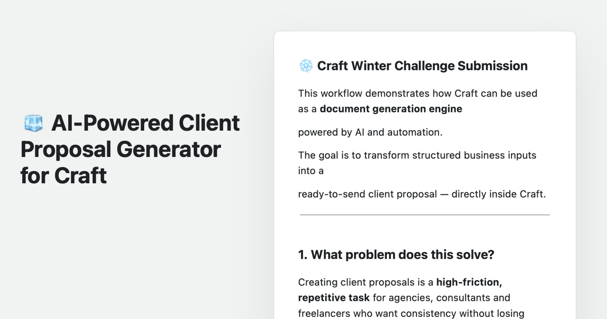 AI-powered client proposal generator. Structured inputs become ready-to-review proposals in Craft.